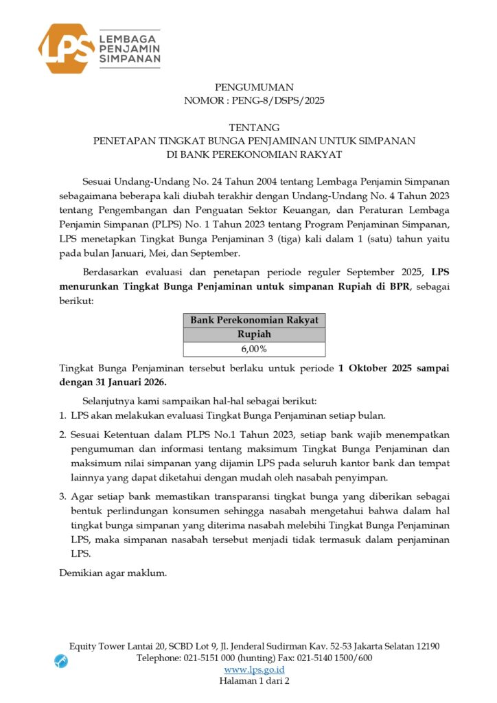 Tingkat Bunga Penjaminan LPS BPR Sungkunandhana merupakan peserta penjaminan LPS.Maksimum nilai simpanan yang dijamin LPS Per Nasabah Per Bank adalah Rp 2 Miliar.Untuk Mengetahui tingkat bunga penjaminan LPS silahkan Akses di sini